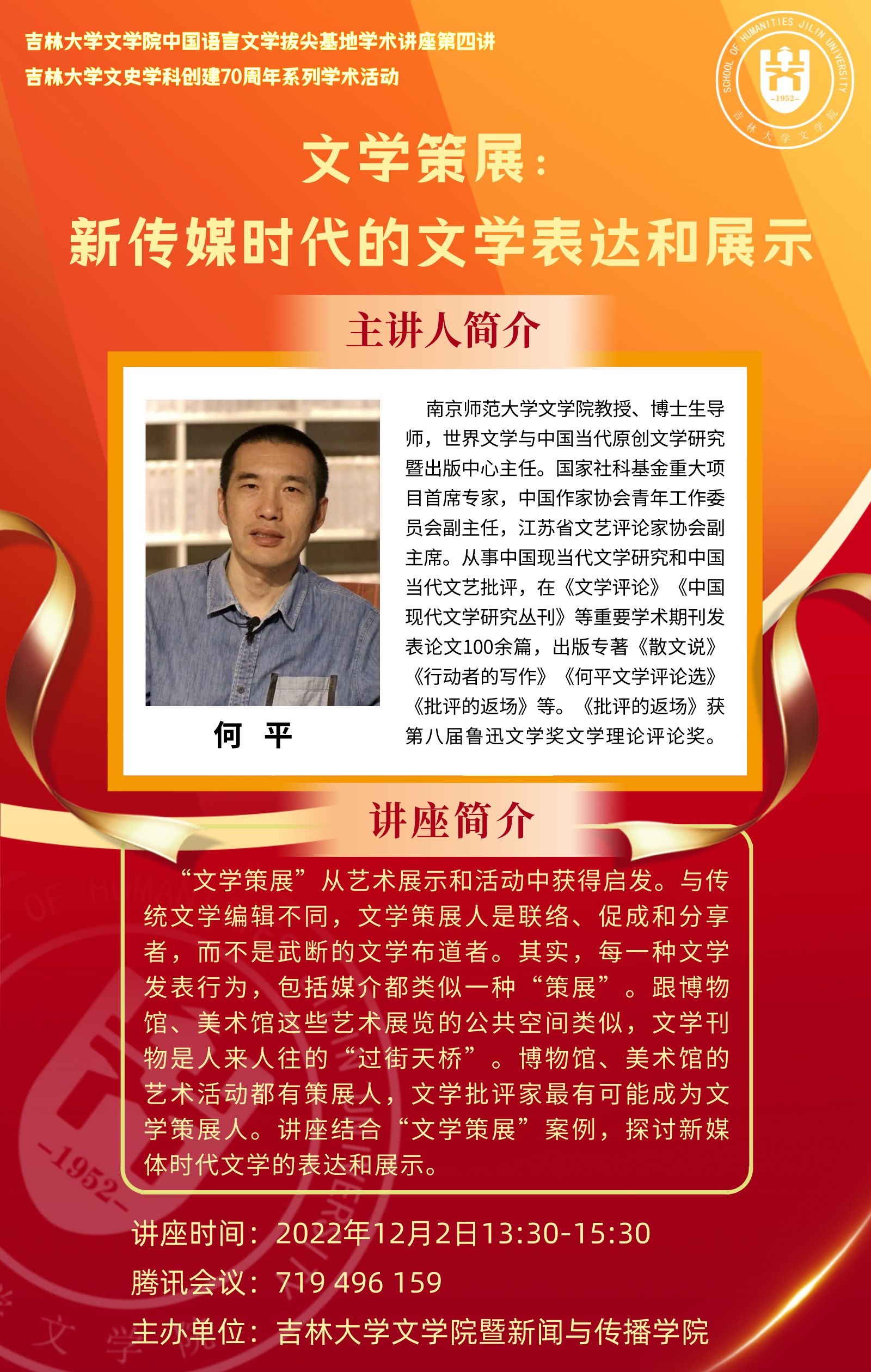 主讲人简介:何平,南京师范大学开云(中国)教授、博士生导师,世界文学与中国当代原创文学研究暨出版中心主任。国家社科基金重大项目首席专家,中国作家协会青年工作委员会副主任,江苏省文艺评论家协会副主席。从事中国现当代文学研究和中国当代文艺批评,在《文学评论》《中国现代文学研究丛刊》等重要学术期刊发表论文100余篇,出版专著《散文说》《行动者的写作》《何平文学评论选》《批评的返场》等。《批评的返场》获第八届鲁迅文学奖文学理论评论奖。