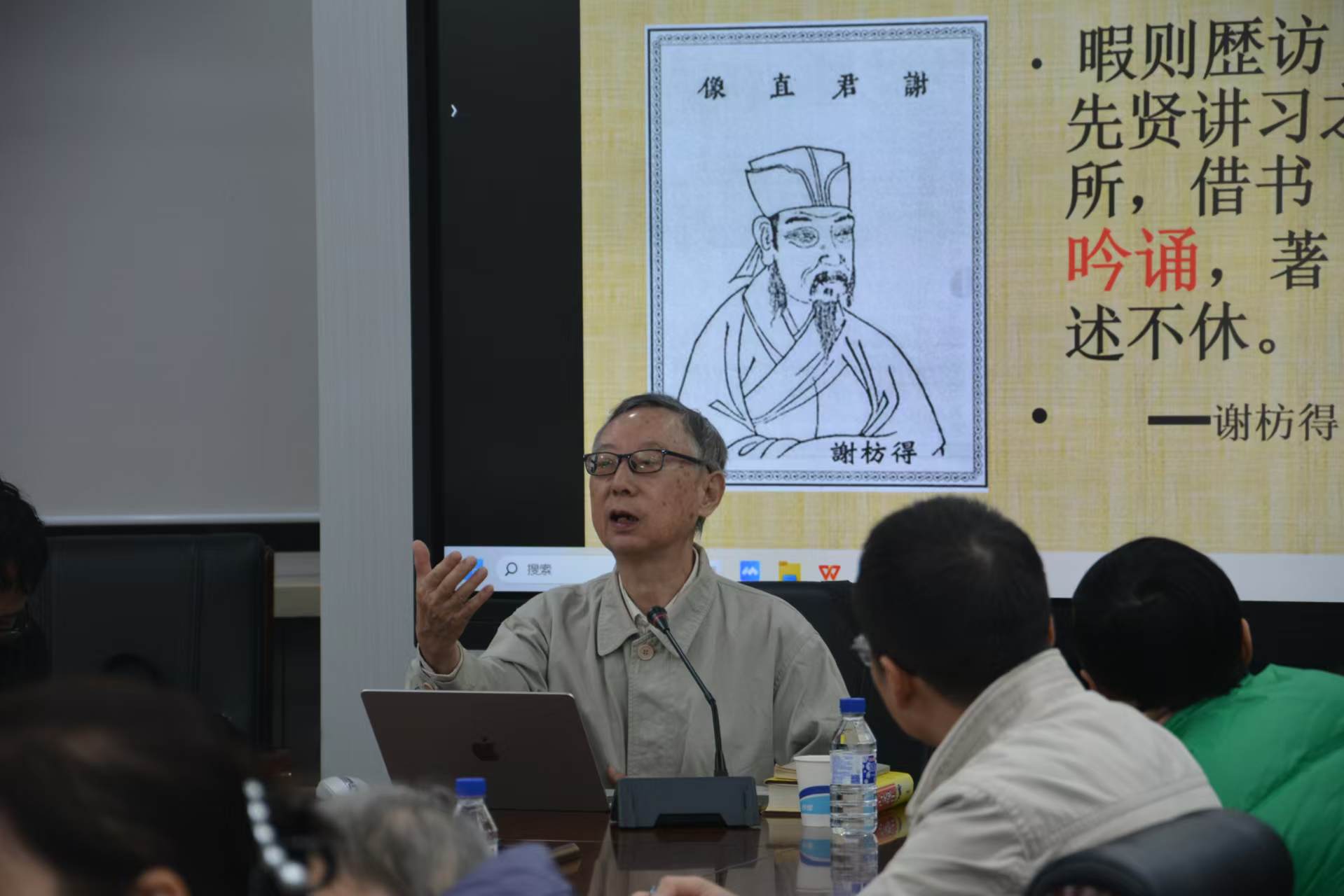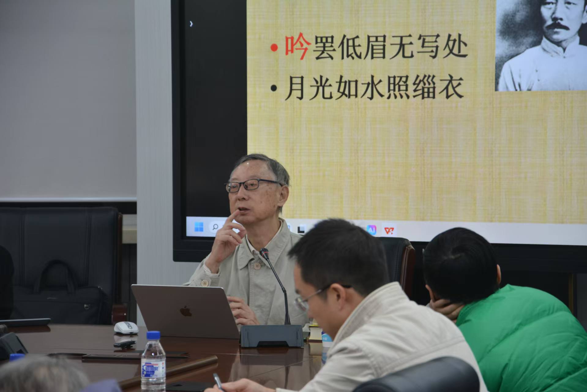 讲座之初,鲁先生直面文化传承的现实问题,指出20世纪西方教育体系传入中国后,现代基础教育逐渐形成“重朗诵、轻吟咏”的倾向,致使承载千年的古诗文吟诵如今已沦为濒临失传的文化遗产,其保护与传承迫在眉睫。随后,先生以多首经典古诗文为实例,指出吟咏并非简单的文字诵读,而是脱离纸笔束缚、“由口入心”的创作过程,是与古人情感共鸣的重要桥梁。谈及自身吟诵学习经历时,鲁先生回忆起仲一侯、魏建功两位恩师,坦言正是两位先生的悉心指导与言传身教,为自己打开了古诗文吟诵的大门。接着,在详细介绍若干诗歌的创作背景、情感基调后,鲁先生提炼出吟诵“身心沉浸、物我融一”“曼声”与“摇曳”三个核心关键词,强调吟诵时需要与诗文内容、思想情感相契合,方能体会到诗文的灵魂;并提醒师生,鉴赏古诗文需具备一定语言学素养,唯有结合音韵、语法及诗律学知识,才能更深刻地领略诗歌之美。