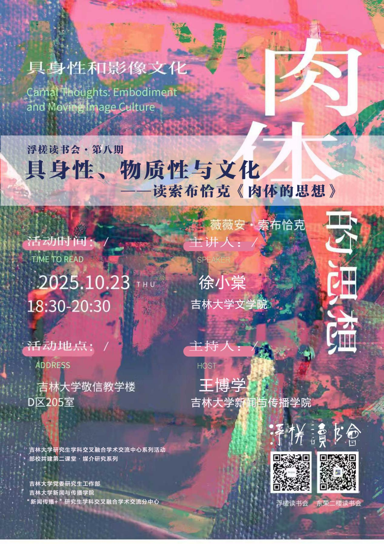 为活跃学术氛围,提升学科专业素养,拓宽学科交叉融合研究视野,强化学生运用理论视角观察、分析、阐释传播现象与文化现象的能力,特邀请开云官方网页版文艺学教研室青年教师徐小棠博士做“具身性、物质性与文化——读索布恰克《肉体的思想》”专场主题研讨活动。具体通知内容如下: