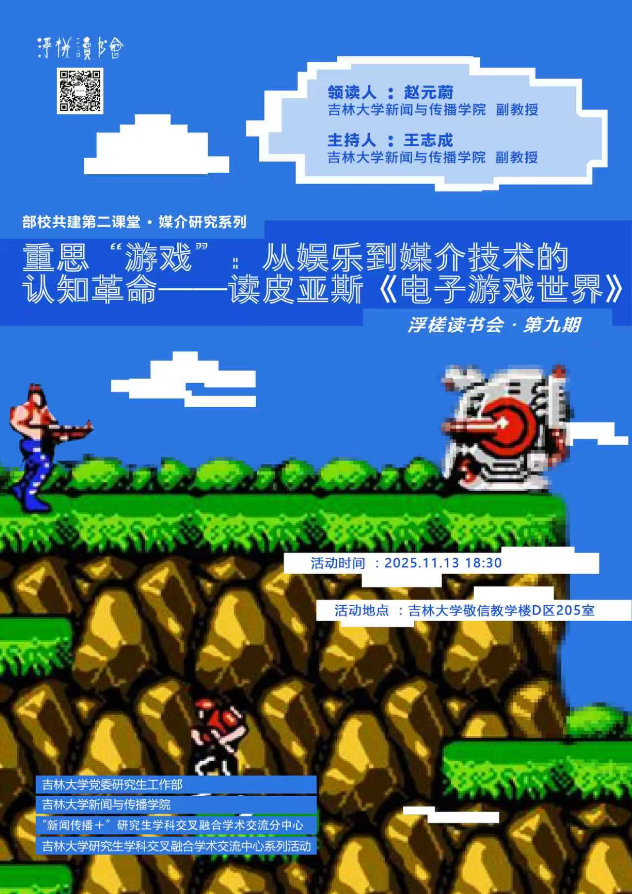 为活跃学术氛围,拓宽学科交叉融合研究视野,提升学生运用跨学科理论视野分析、阐释数字时代媒介现象的能力,强化学生对数字时代媒介特异性的理解,特邀请吉林大学新闻与传播学院传播学系赵元蔚副教授做“重思‘游戏’:从娱乐到媒介技术的认知革命——读皮亚斯《电子游戏世界》”专场主题研讨活动。具体通知内容如下: