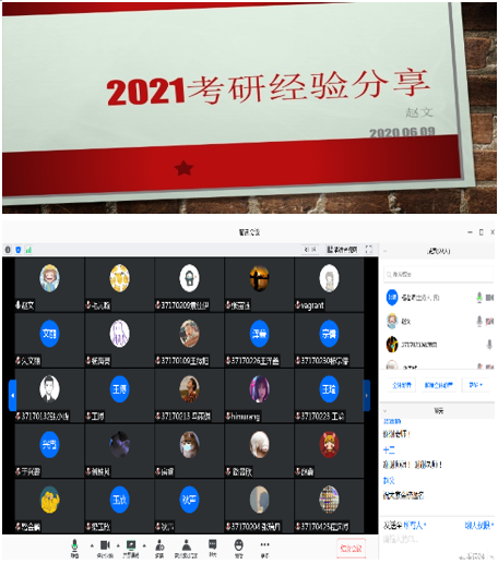 会议于下午16:30通过腾讯会议召开,由我院2019级新闻学专业硕士赵文同学担任主讲人。会议开始,赵文同学首先向大家介绍了2018年考研的具体情况,并从亲身经历出发,分享自己择校的经验,介绍考研的整个流程,同时她还强调,考研是个长时间的战争,“只有到了拿到录取通知书入学时,才算是考研的真正结束。”随后,赵文同学从自己的实战经验出发,围绕试卷题型、内容占比、复习规划、推荐书籍、答题技巧等多个模块展开,详细介绍了英语、政治以及专业课的复习方法和注意事项,并强调做计划时应因人而异,根据自己的实际情况进行调整。同时强调备研期间的心态非常重要,应注重身心协调,摒弃焦虑、消极等不好的心理卫生习惯,以最饱满的状态来迎接考研。最后,同学们在评论区与主讲人进行提问互动,2017级辅导员杨一博老师也针对考研过程中的注意事项为大家提出建议。