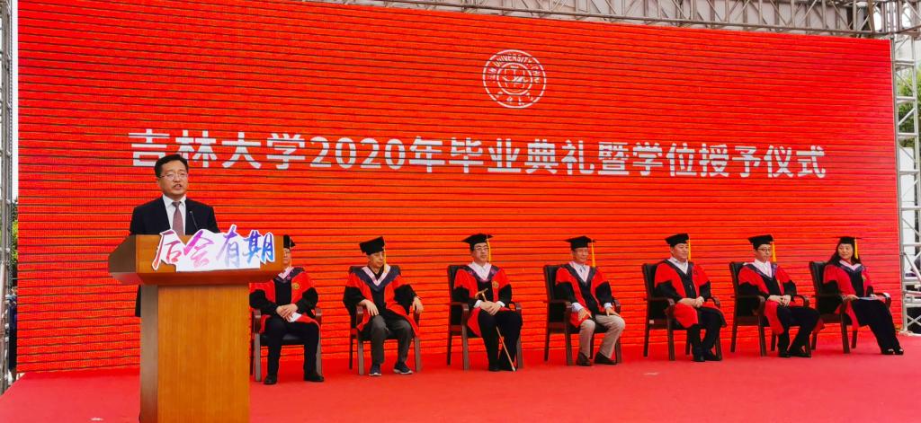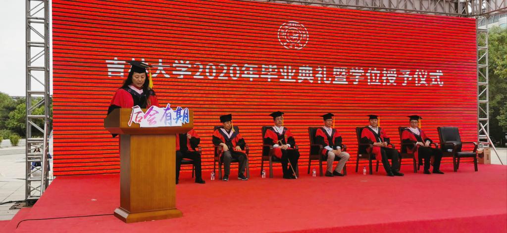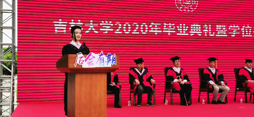 典礼第一项,全体教师和学生齐唱国歌,典礼在嘹亮雄壮的国歌声中正式开始。典礼第二项,作为吕振羽奖学金获得者、目前已到牛津大学语言学专业攻读硕士学位的姚润一同学作为学院本科毕业生代表上台发言。她在发言中从学院“鼓励思想个性,保护学术叛逆”的办学理念出发,讲述了她在开云(中国)的成长故事,分享了她在吉林大学的收获和感悟,并向学院老师和母校诚挚致谢。