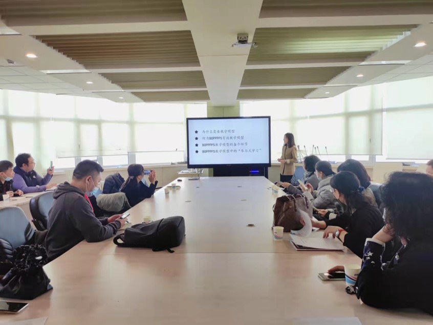 宋婷首先以BOPPPS有效教学模型为例阐述了课堂中恰当应用教学模型的必要性,具体介绍了BOPPPS有效教学模型的六大模块构成及使用方法,并结合自己的教学实践经验,分享了BOPPPS模型在教学中的具体实施路径及有效方法,就学生参与式学习环节,多角度地分享了课堂教学方法,深入地探讨了以学生为中心课堂教学改革的重要性。