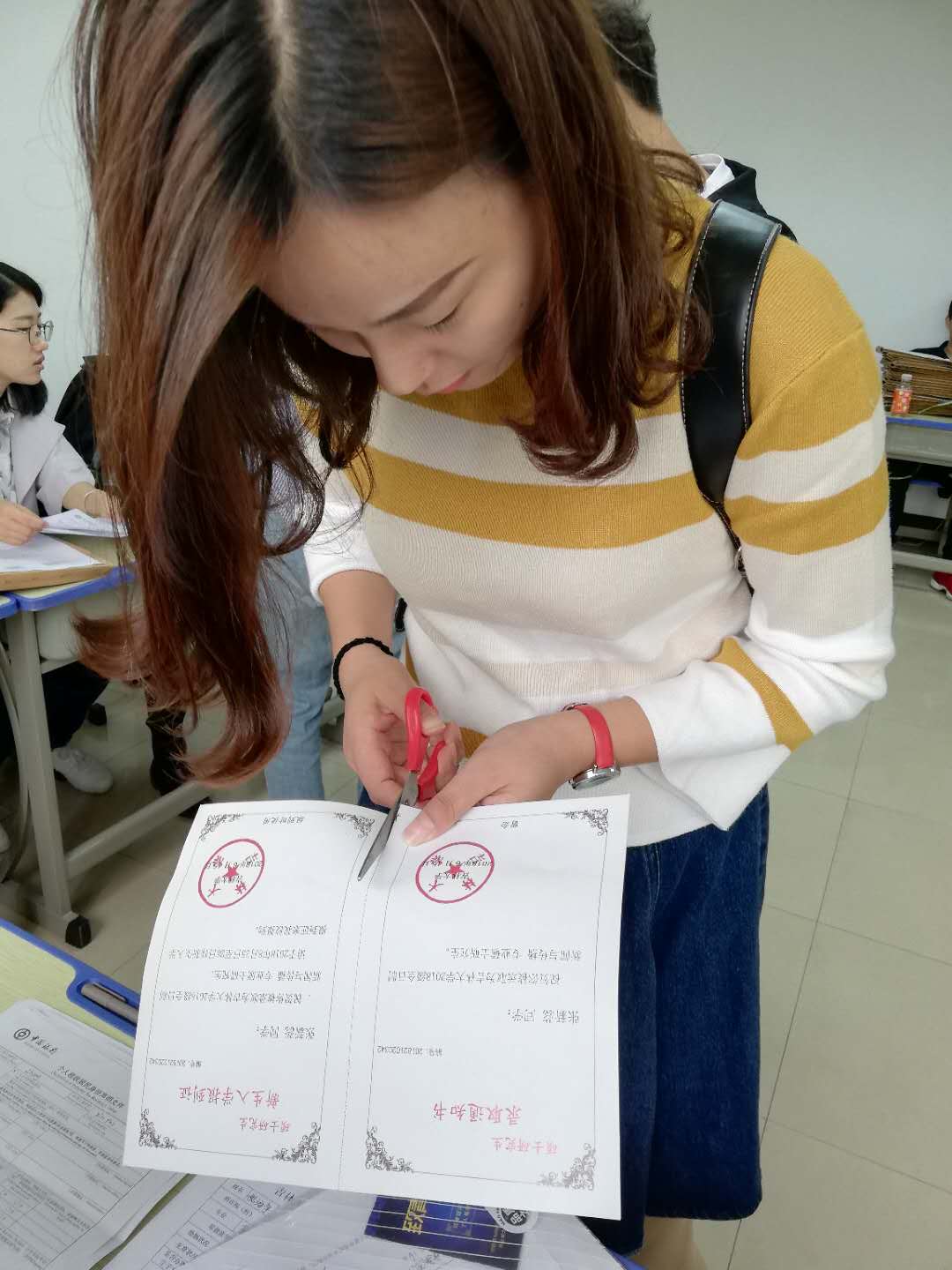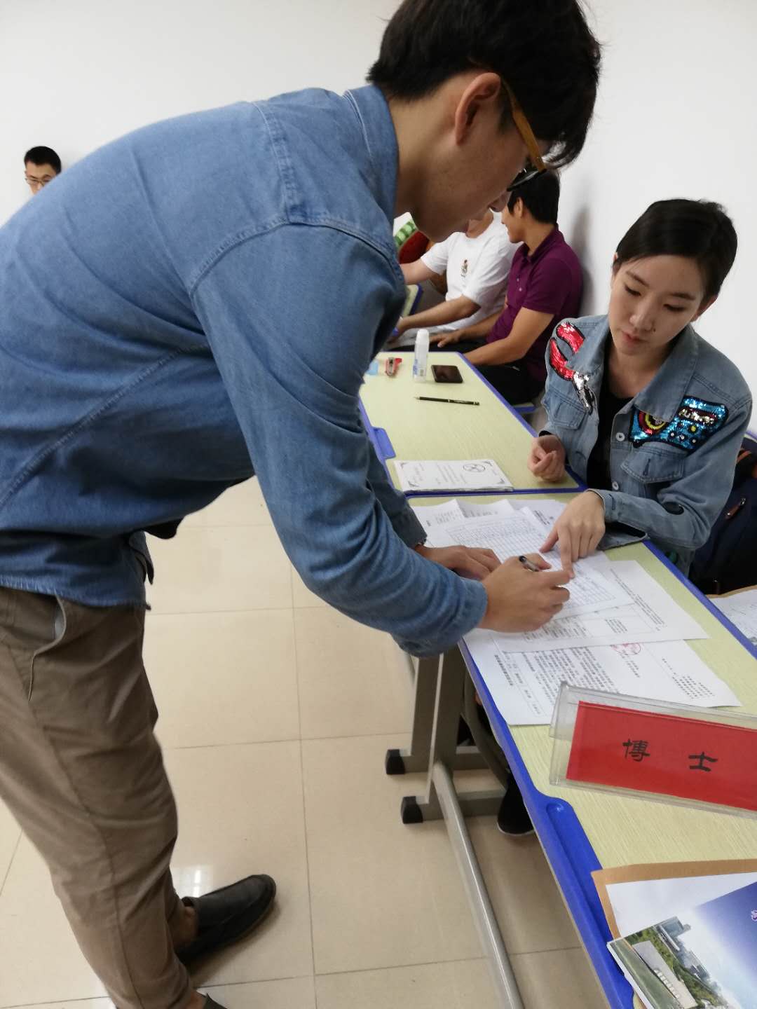 一张新生报到流程图、一个档案袋,这是新生入学的伴手礼;“同学,你看一下档案袋里面一共有四样东西,你看看缺不缺”这是来自师哥师姐的关切口令之一。接下来,婚育情况调查表、党组织关系凭证、还款协议书等报到材料逐一核对过,再由本人签字,领取学费收据,报到工作就算完成了。