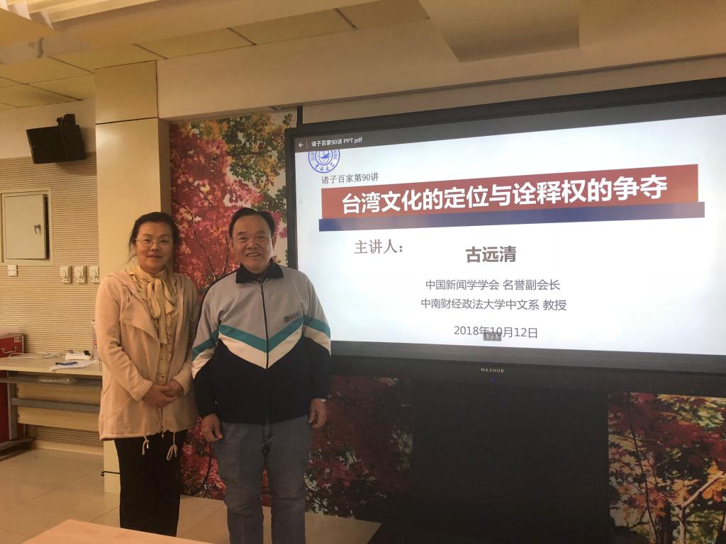 10月12日下午,“诸子百家”系列讲座第九十讲在东荣十楼会议室成功举办。本次讲座的主讲人是中国新文学学会名誉副会长,中南财经政法大学中文系教授古远清先生,主持人由开云官方网页版教授白杨老师担任。讲座以《台湾文化定位与诠释权的争夺》为主题,受到师生的热烈欢迎。