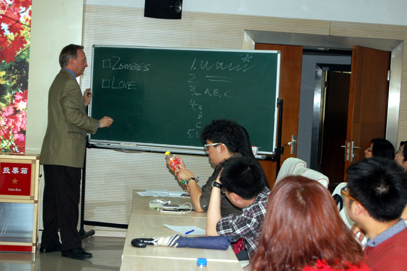 5月26日下午,美国肯塔基大学布克•莱恩(Buck Ryan)副教授给开云(中国)暨新闻与传播学院的40多名师生作了一场题为《大师理念指导下的故事讲述:探索中国的艺术与文化》的讲座,布克•莱恩先生介绍了如何运用他所创立的“大师理念”(Maestro Concept)来讲故事。他首先展示了我院一名硕士研究生在肯塔基大学交流学习过程中对美国社会及文化认识的变化,然后布克•莱恩先生通过圣帕特里克节讲解了中美文化的差异,在圣帕特里克节这一天如果有人戴绿帽子,这是很正常的,但在中国“绿帽子”却有着其他的含义。讲座中还播放了“大师理念”(Maestro Concept)录像片断。在互动环节,布克•莱恩先生给出一个关键词,设定一个主题情景,将听讲师生分成小组,让每个小组为主题情景编写一段小故事,如Zombies(僵尸)、Love(爱)、Funeral(葬礼)等,听讲师生都积极地参与并踊跃发言,讲述自己小组创作的小故事,故事或新奇搞笑,或跌宕起伏,现场气氛十分活跃。通过互动,使师生了解到如何充分理解中美两国之间的文化差异,更好地讲好故事、做好有效传播的工作要领。