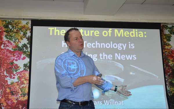 月20日上午,拉尔斯•威尔耐特教授为我院师生作了题为《媒体未来:技术如何改变着新闻》的讲座。讲座主要集中探讨了新技术如何影响娱乐媒体,以及新闻生产与消费。威尔耐特教授的报告主要包括三个部分。首先,基于当前美国的研究样本,他探讨了传统大众传媒的商业模式如何被因特网所破坏,以及这些“旧”媒介如何努力去适应“新”网络环境。随后,威尔耐特教授与在场的师生一同审视了在过去的几年里媒体消费如何变化,以及这些变化在美国如何影响传统媒体与网络媒体。最后,威尔耐特教授详细讨论了新的媒体技术,如无人机、社交媒体的应用技术、虚拟现实报道技术等如何影响现代新闻实践。
