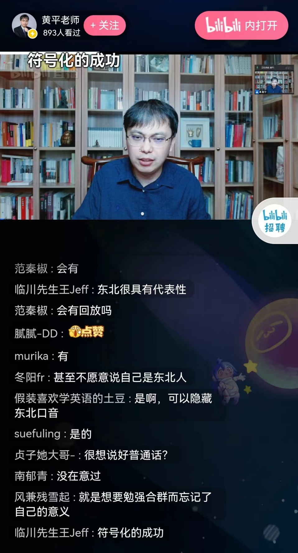 在互动阶段,鞠惠冰教授将黄平教授对于新东北作家群的文学分析概括为新时代东北文化的通关密语,并就村上春树小说对双雪涛小说创作的影响与黄平教授展开交流。黄平教授从这一角度对双雪涛等作家的文学创作脉络进行了梳理,认为从村上春树到双雪涛,他们的文学脉络共同呈现出一种逃离。之后黄平教授对评论区老师同学们的提问进行了一一解答。