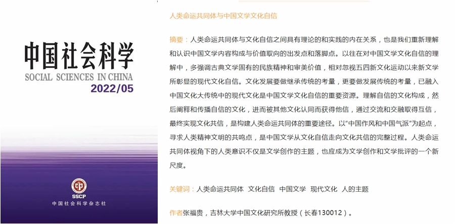 近日,吉林大学哲学社会科学资深教授张福贵在《中国社会科学》2022年第5期发表文章《人类命运共同体与中国文学文化自信》。