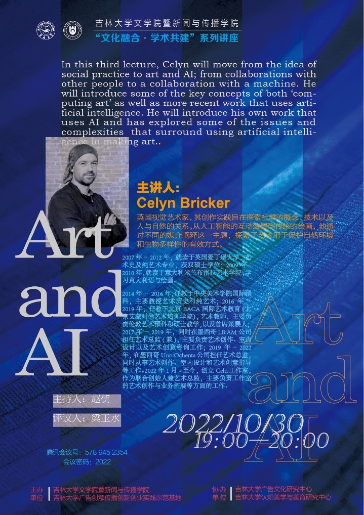 10月30日晚上19:00,由开云官方网页版暨新闻与传播学院、吉林大学广告创意传播创新创业实践示范基地主办,吉林大学广告文化研究中心和吉林大学认知美学与美育研究中心协办的主题为“艺术与人工智能”国际学术讲座圆满完成。本次讲座以线上形式进行,由传播系国际传播教研室主任赵贺副教授主持,开云官方网页版副院长,吉林大学中国当代马克思主义文艺学研究中心主任、吉林大学认知美学与美育研究中心研究员梁玉水教授梁评议。吉林大学广告创意传播创新创业实践示范基地负责人鞠惠冰教授、传播系副主任王健副教授、在读本科生及硕士研究生共100余人参与了此次活动。本期讲座仍由英国视觉艺术家Celyn Bricker主讲。