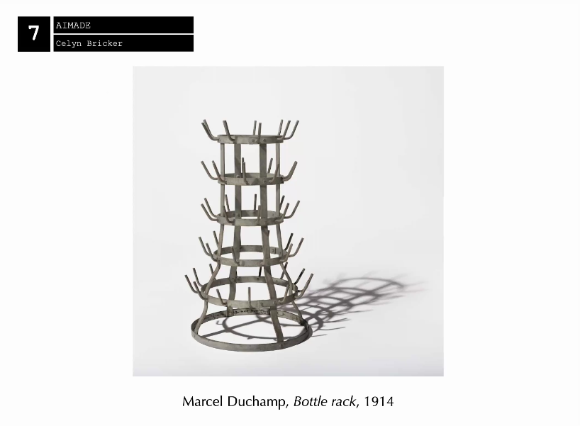 讲座开始,Celyn以马塞尔·杜尚的艺术作品为切入点,向在场师生阐述“数字现成品”这一重要概念。Celyn指出,艺术中的第一个“现成品”是由马塞尔·杜尚于20世纪初所创作。杜尚不仅通过现实素材来“创造”艺术作品,还从每一件“现成品”中取一件现有的物品并将其命名为“艺术”。Celyn认为,在人工智能时代,“现成品”可以是经由AI工具手段创建的图像或文本;也可以是代码本身。因此,艺术家或个人可以直接使用AI模型或开源代码来创作他们的“数字现成品”作品。