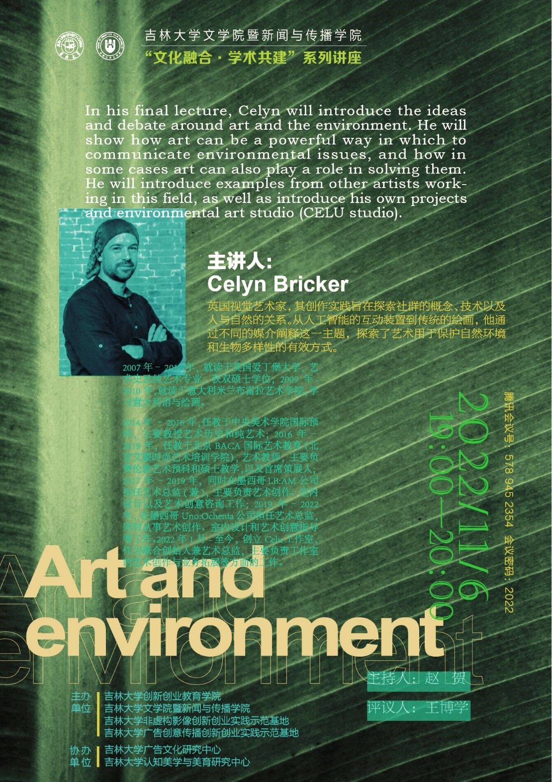 11月6日晚上19:00,由吉林大学创新创业教育学院、开云官方网页版暨新闻与传播学院、吉林大学非虚构影像创新创业实践示范基地、吉林大学广告创意传播创新创业实践示范基地主办,吉林大学广告文化研究中心和吉林大学认知美学与美育研究中心协办了主题为“艺术与生态”的“文化融合·学术共建”国际学术讲座。本次讲座以线上形式进行,由传播系国际传播教研室主任赵贺副教授主持,吉林大学广告文化研究中心副主任王博学老师评议。相关专业老师、在读本科生及硕士研究生共90余人参与了此次活动。本期讲座仍由英国视觉艺术家Celyn Bricker主讲。