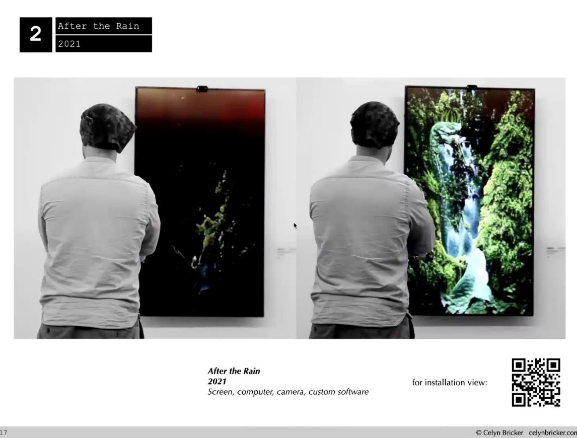 有别于《珊瑚》表达出人类对自然界进行人为破坏的后果,Celyn的另一幅名为《雨后》的作品则体现出人类对自然界变化予以关注的重要性。当观众注视这幅作品时,屏幕上的溪流和雨林会逐一显现,而在无人关注时,屏幕会熄灭变为黑色。事实上,人类的共同关注与参与,才是解决环境问题的关键所在。