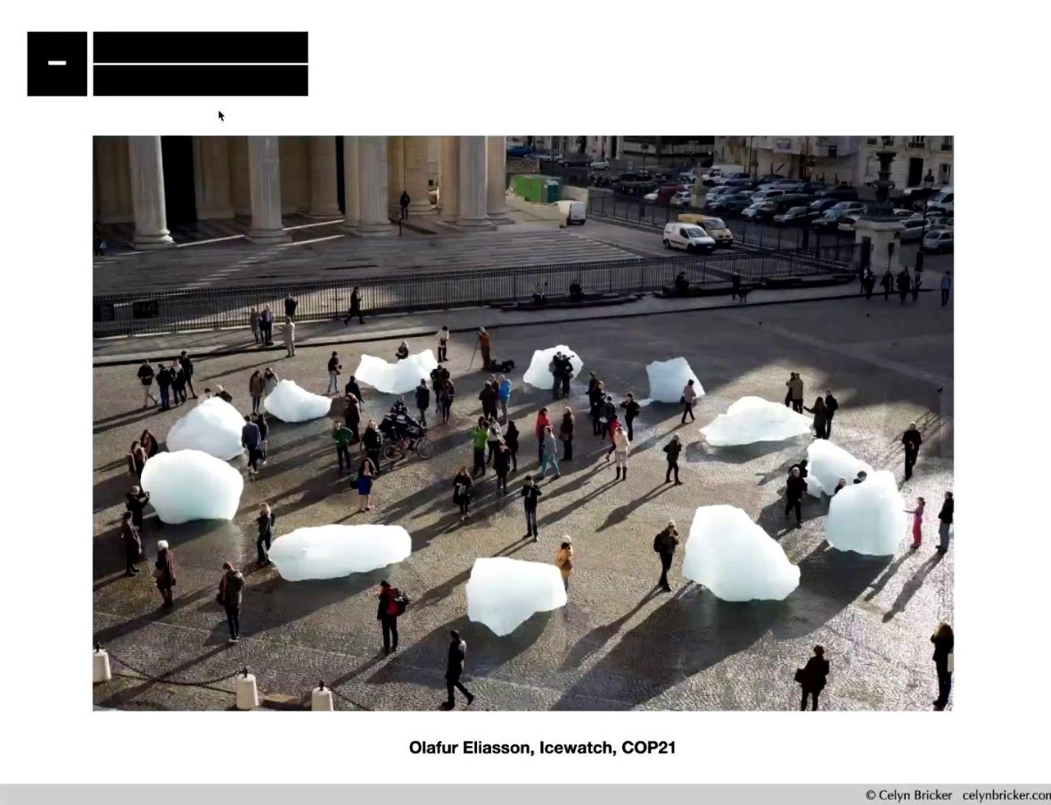 本次讲座中,Celyn再一次向在场师生展示了艺术家Joseph Beuys的作品。Celyn表示,这幅大家熟悉的《7000棵橡树》体现了艺术与环境的关系。通过这一作品,当地的环境逐渐改善,人与自然的相互影响逐渐显现。更重要的是,Joseph Beuys的尝试在当时极具创新性与开拓性。在二十一世纪的现在,越来越多的艺术家开始关注环境生态,并创作了更多关于气候的作品。如在巴黎气候大会上,埃利亚松把冰川从冰岛搬到会议现场,并将这些冰川放置成时钟形状,令其随着大会的进行而融化。埃利亚松的这一作品使观众能够更为真切地感受和触摸到气候变化的真实存在与影响。