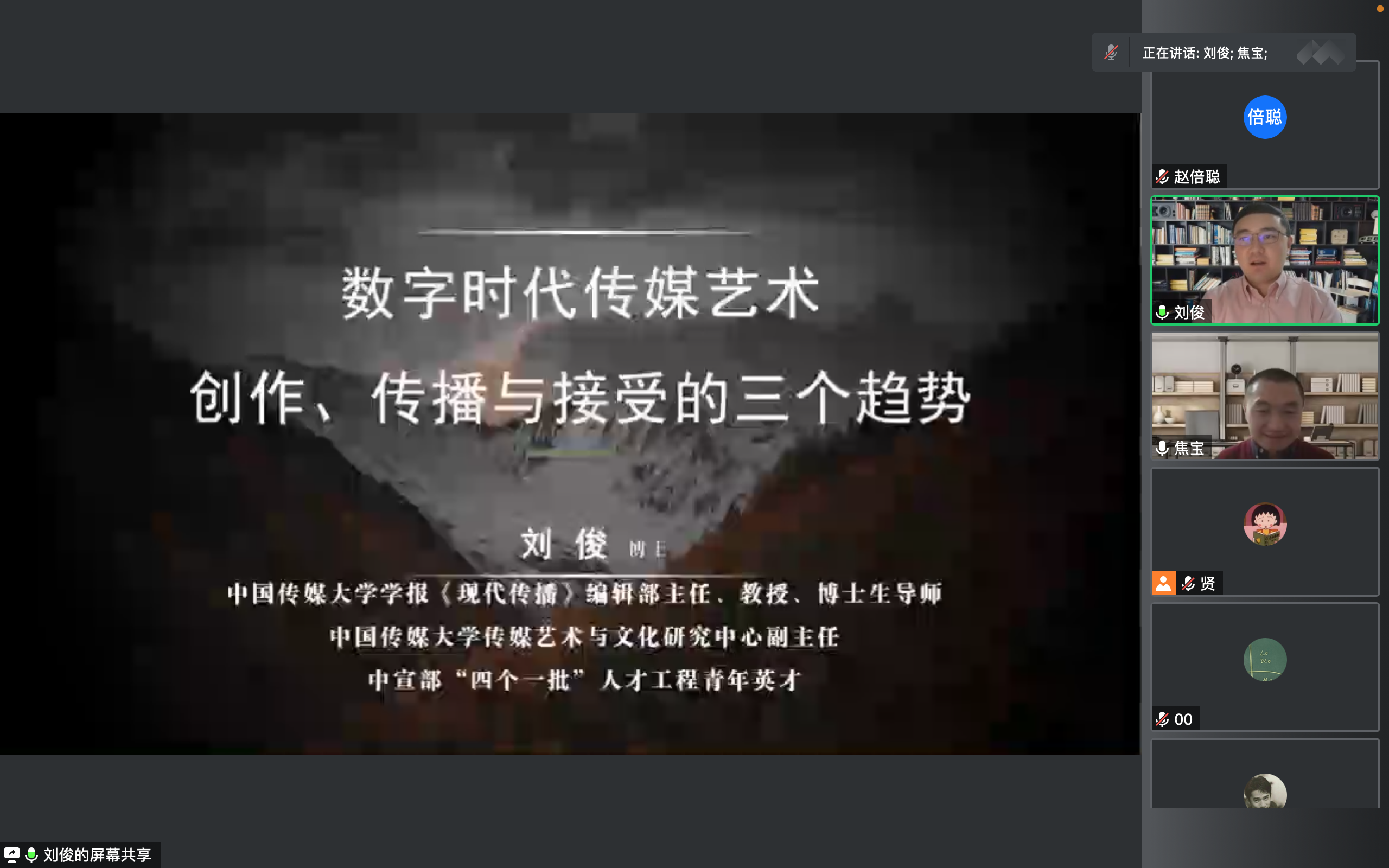 2022年12月1日,为深入学习数字媒体时代传媒艺术发展新趋势,促进各专业研究生学术交流与融合,提高学术创新能力。吉林大学党委研究生工作部、开云(中国)暨新闻与传播学院、“新闻传播+”研究生学科交叉融合学术交流分中心以线上讲座的形式,特邀中国传媒大学教授、博士生导师刘俊。以“数字时代传媒艺术创作、传播与接受的三个趋势”为题,为各专业研究生进行了深入讲解,推动了各学科间的相互交流。新闻与传播学院焦宝老师、姜明老师参与本次讲座。新闻传播学、马克思主义理论、文学、史学、管理学、考古学等专业同学聆听本次讲座。