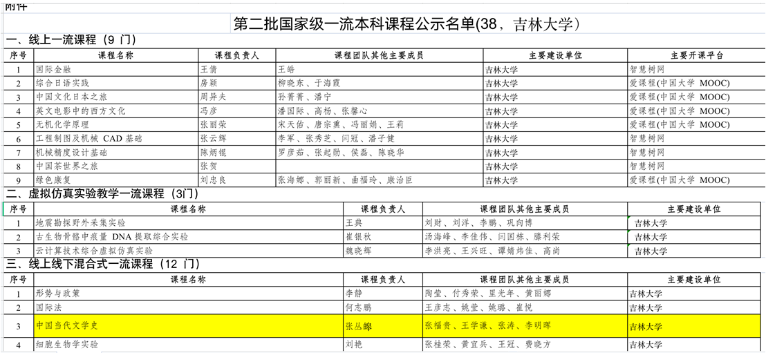 2023年4月11日,教育部高等教育司发布通知,公布了第二批国家级一流本科课程认定结果,其中我院张丛皞教授作为课程负责人主持建设,张福贵、王学谦、张涛、李明晖四位老师作为主要参与人共同参与运营的《中国当代文学史》课程成功入选国家级线上线下混合式一流课程。