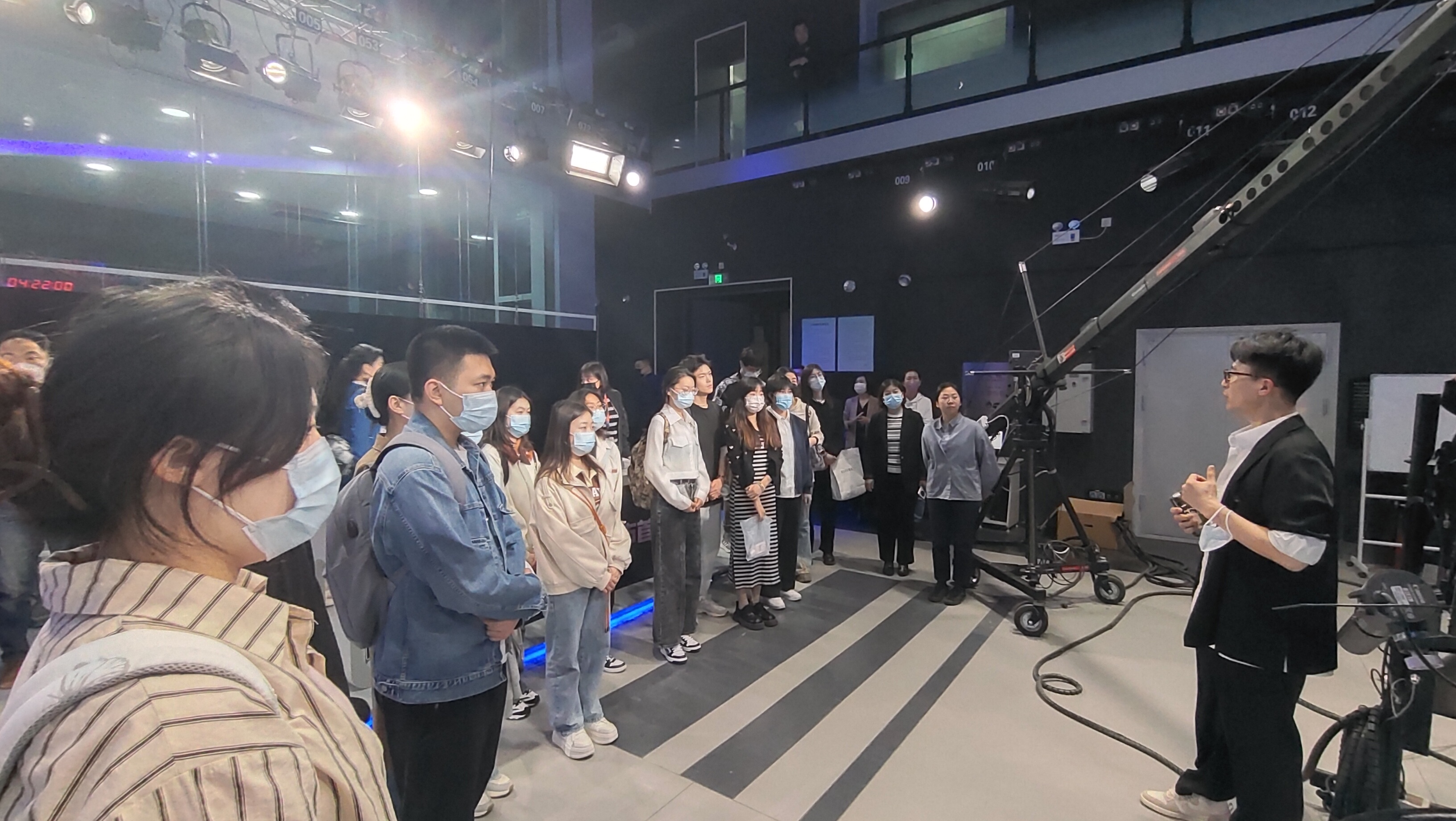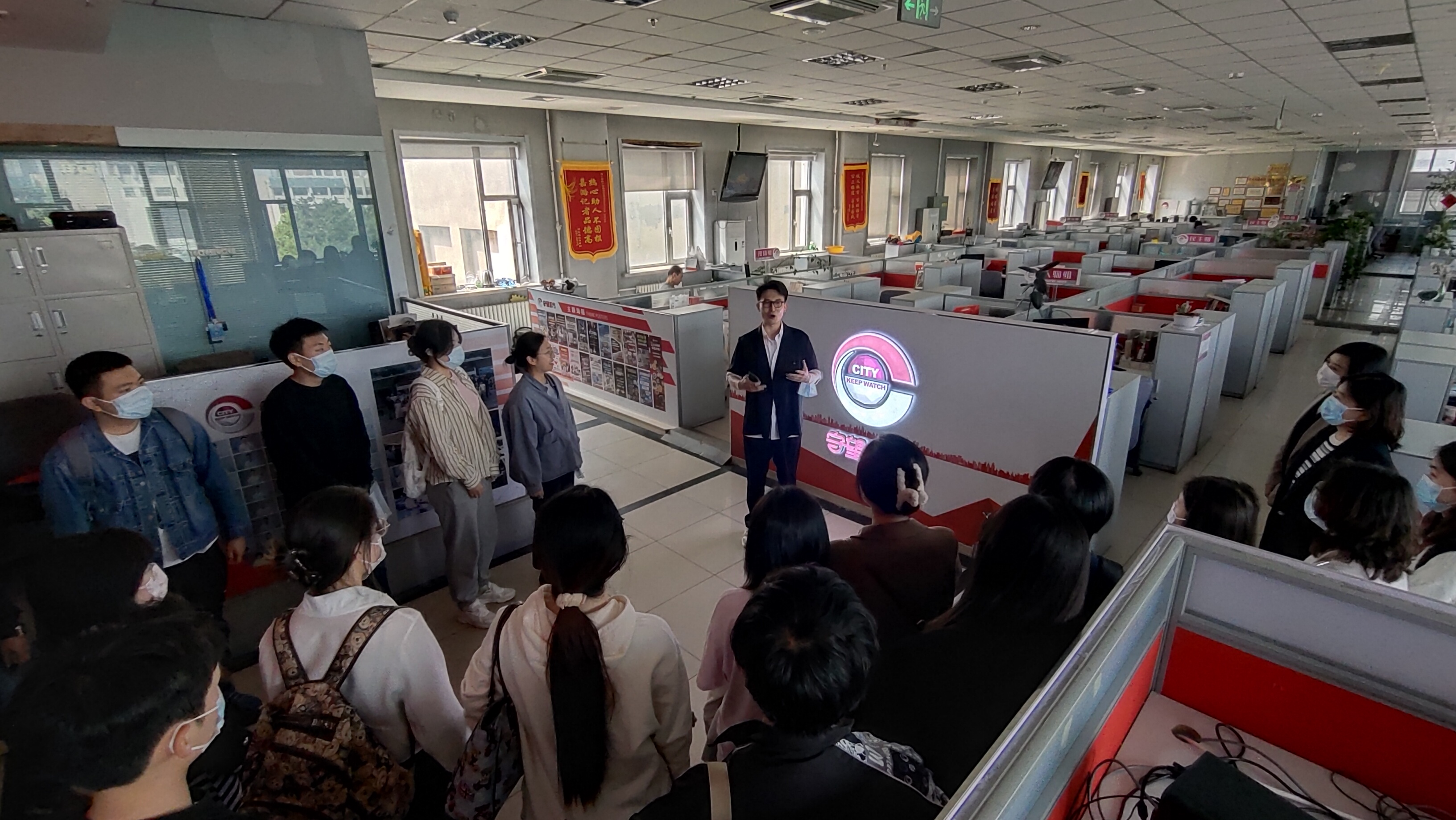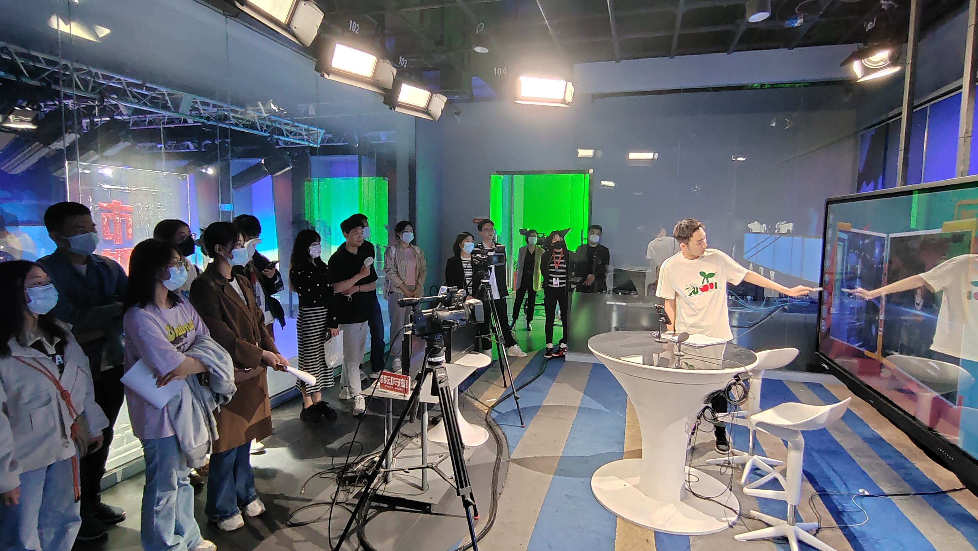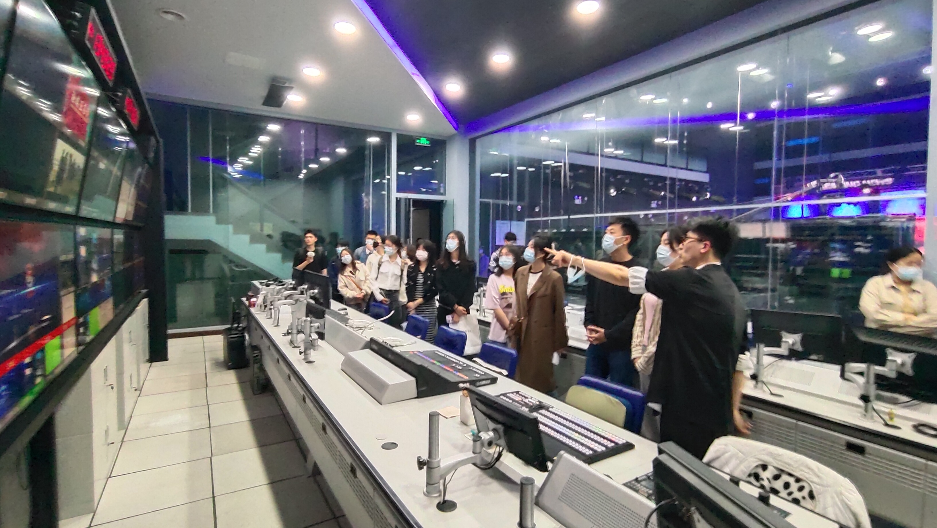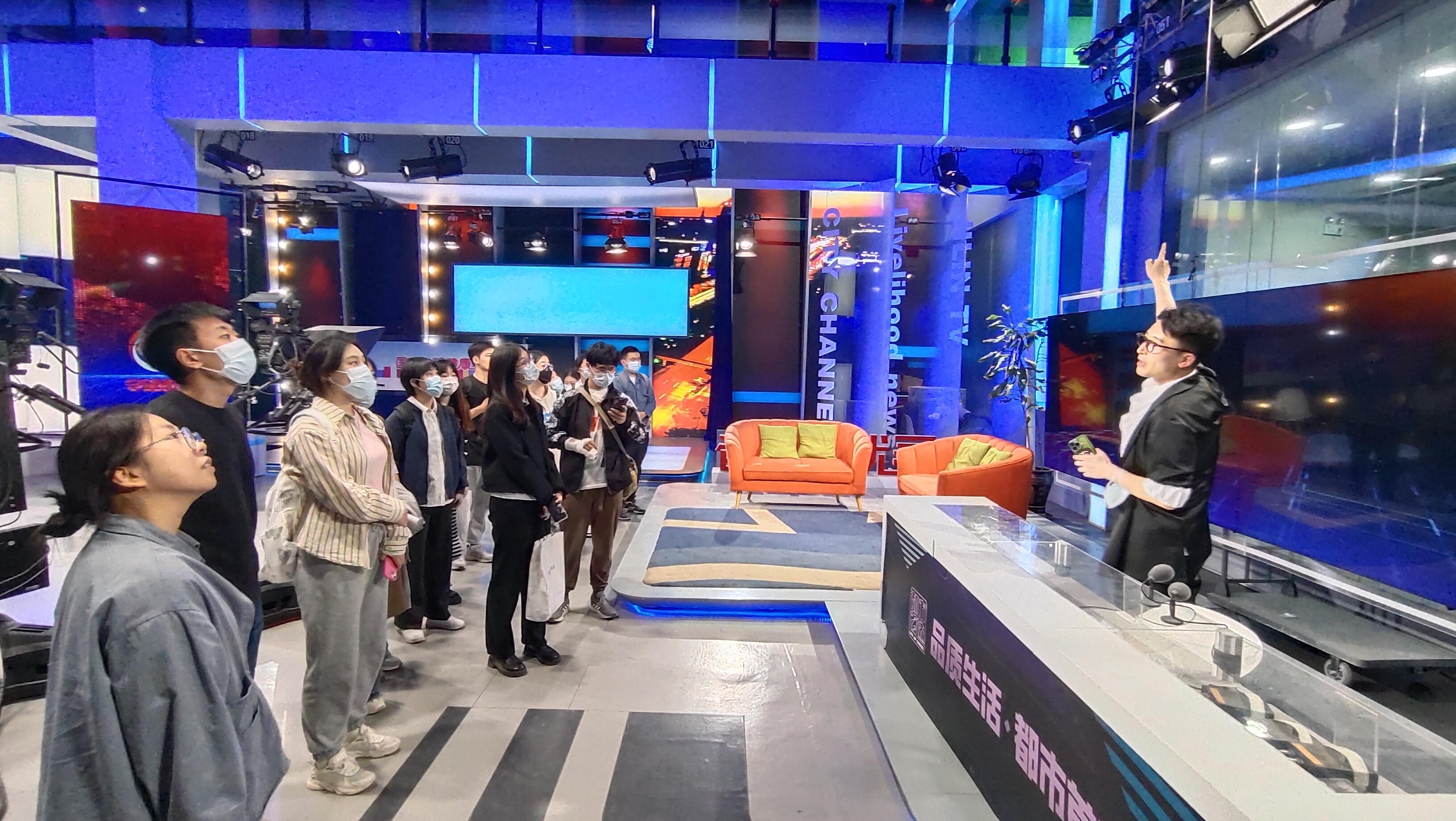 活动中,都市频道对学院调研团队的来访表示热烈欢迎,《守望都市》栏目主持人桉阁带领师生调研团进入工作区参观,介绍了栏目编辑制作、编审等各个工作区的职能和配置,学生们深入媒体一线了解了各类工作岗位的情况。桉阁还重点讲解了演播室的节目制作流程,陪同同学们深度沉浸式体验节目制作的现场感和科技感。随后,在实习生面试环节,电视台老师们对学院学生逐一进行了专业面试,对同学们给予了高度的肯定。