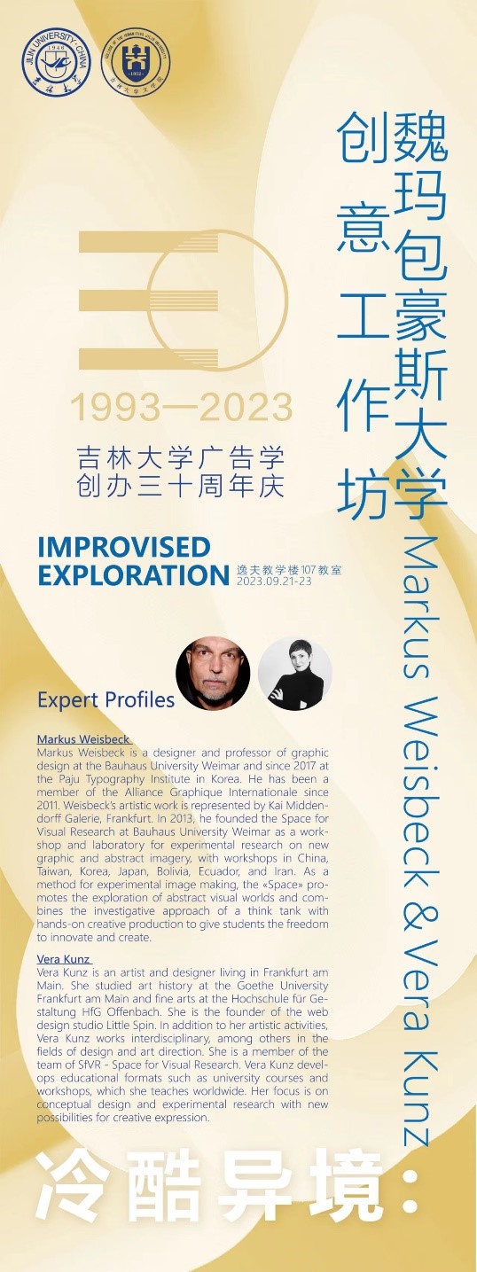 为庆祝吉林大学广告学创办三十周年,2023年9月21日至23日,吉林大学广告文化研究中心邀请到了魏玛包豪斯大学Markus Weisbeck教授和Vera Kunz教授在中心校区逸夫教学楼107教室举办”IMPROVISED EXPLORATION”创意工作坊。工作坊由吉林大学广告文化研究中心副主任王博学主持,吉林大学广告文化研究中心副教授许多澍、吉林大学广告文化研究中心副教授王志成、吉林大学广告文化研究中心讲师生琳一同参加活动。