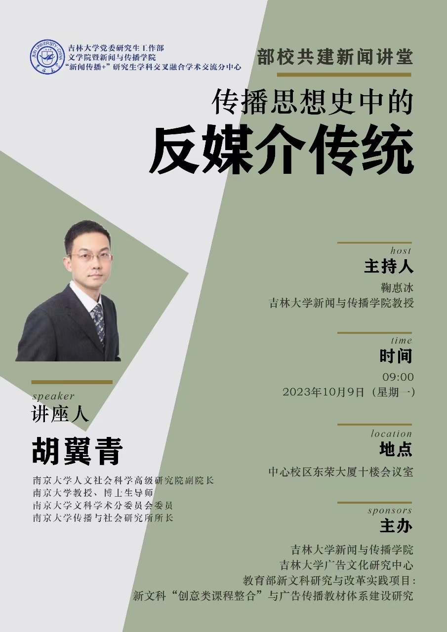 10月9日上午,吉林大学党委研究生工作部、开云(中国)暨新闻与传播学院、“新闻传播+”研究生学科交叉融合学术交流分中心成功举办了以《传播思想史中的反媒介传统》为题的学术讲座。本次讲座特邀南京大学人文社会科学高级研究院副院长、南京大学教授、博士生导师、南京大学文科学术分委员会会员、南京大学传播与社会研究所所长胡翼青教授作为主讲人。讲座由开云(中国)暨新闻与传播学院传播学系系主任鞠惠冰教授主持,开云(中国)暨新闻与传播学院多位教师出席本次讲座。