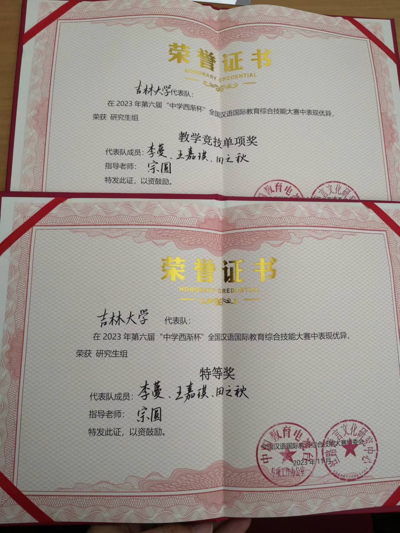 11月12日,我院宗圆老师带领2022级汉语国际教育专业研究生李蔓、王嘉琪、田之秋三名同学在“2023年第六届‘中学西渐杯’全国汉语国际教育综合技能大赛总决赛”中荣获研究生组特等奖、教学竞技单项奖。