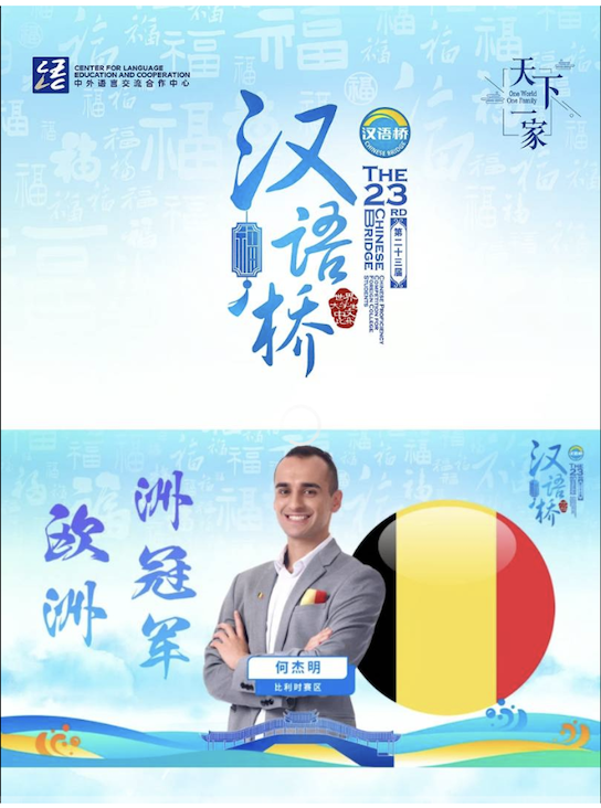 从比利时赛区选拔赛到最后的全球总冠军决赛,何杰明都情真意切地表达了对中国语言文化的痴迷、对中国锦绣河山的热爱,并分享了他在中国旅行的点点滴滴。最终他凭借对中国文化的深刻理解、流畅自如的语言表达征服了评委,夺得第二十三届“汉语桥”世界大学生中文比赛全球总冠军。他表示未来会继续学好汉语,讲好中国故事,成为中欧友谊的桥梁。
