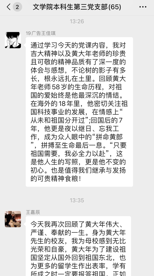 殷殷嘱托犹在耳,踔厉奋发正当时,微党课结束后,支部全体成员纷纷表示,作为新时代吉大学子,我们要学习黄大年老师心有大我、至诚报国的爱国情怀,教书育人、敢为人先的敬业精神,淡泊名利、甘于奉献的高尚情操,积极进取,开拓创新,牢记习近平总书记嘱托,努力成长为堪当民族复兴重任的时代新人。