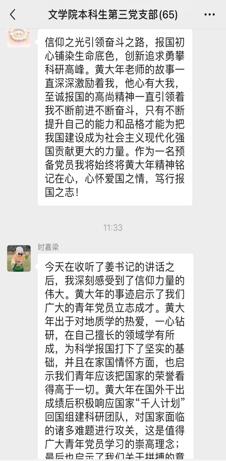支部党员康竞文表示:我深刻感受到姜书记所说信仰力量的伟大。黄大年先生热爱地质学,在自己的领域中一心钻研,不断拼搏,为国家地质学事业打下了坚实的基础,启示着我们应该以家国为己任,这是青年党员应当信仰的崇高理念。而黄大年先生吃苦耐劳的科研精神又是一种对于我们拼搏的意义的启示,为我国能源开发做出了巨大贡献,我们应当学习黄大年先生的精神,筑梦踏实,拼搏学习,投入祖国建设中来!
