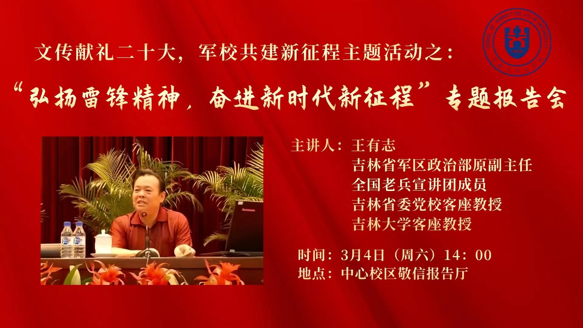 文传献礼二十大,军校共建新征程主题活动——“弘扬雷锋精神,奋进新时代新征程”专题报告会主讲人:王有志 吉林省军区政治部原副主任 全国老兵宣讲团成员 吉林省委党校客座教授 吉林大学客座教授时间:3月4日(周六)14:00地点:中心校区敬信报告厅