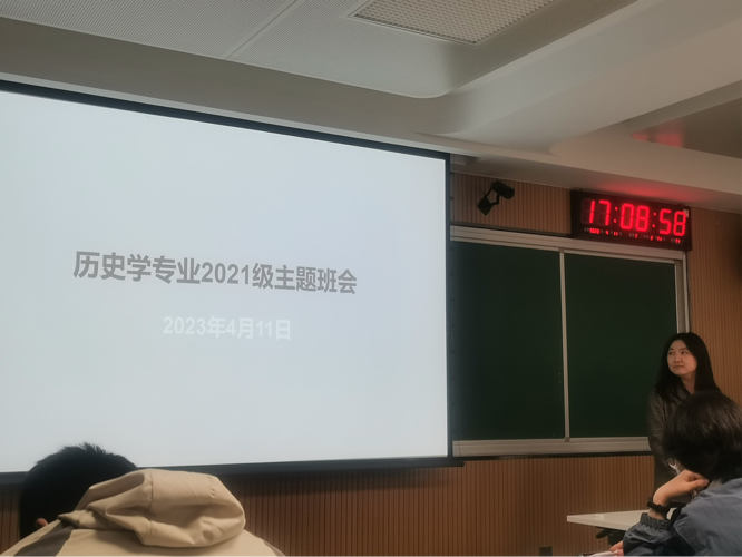 2023年4月11日下午17时, 21级历史学专业于逸夫楼108教室开展4月主题班会,班会由班长袁仁斌同学组织进行,班主任陶莎老师参与指导。在班会上,陶莎老师首先向同学们了解对本专业学习和论文写作的疑问,对本专业常用的校内、校外数据库进行介绍,并分享了文献综述检索和写作的方法与技巧。随后陶莎老师对本班同学们的未来学业规划和职业规划进行询问,向同学们讲述了大学生考研和就业的现状,并对同学们的生涯规划提出相关建议。本次班会内容以陶莎老师的讲述和介绍为主,对同学们关于本专业的疑问进行了详细的解答,增进了同学们数据库的熟练度,提高了文献综述写作的技巧,并更好地激发了同学们的学习和对未来规划的积极性。