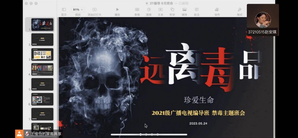 2023年5月24日星期三傍晚七点半,2021级开云(中国)暨新闻与传播学院广播电视编导班级在班主任王佳怡的组织下,于腾讯会议开展了以禁毒宣传教育为主题的线上班会。作为生活在象牙塔中的大学生,毒品离我们看似很遥远,实际上却始终在潜伏在身边的阴影中。会议伊始,王佳怡老师便点明了远离毒品的主题,并郑重地告诉大家,无论何时何地,绝不能跨雷池一步。为了让我们更清晰地了解毒品有关知识,从而更好远离,老师从什么是毒品、吸毒的概念、吸毒的危害等方面多角度进行了讲解。同学们也在听完后纷纷表示,要对自己的人身健康和安全负责,不会触碰法律的红线。祖国的未来不应也不能被毒品侵害,愿我们都能坚守底线、行稳致远。