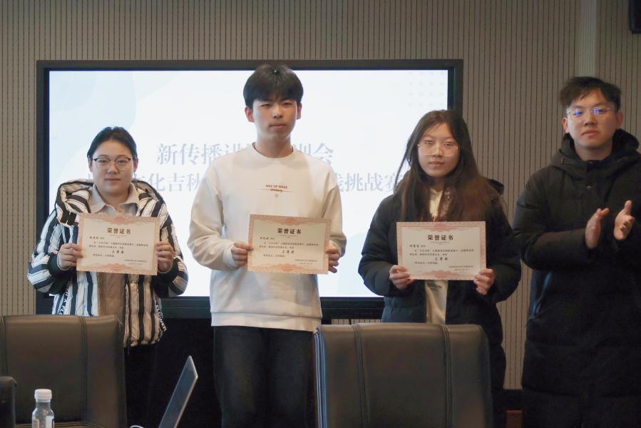 会议第二项,以“文化吉秋”主题新闻实践挑战赛颁奖礼作为本轮寒假班培训的结课总结。本次实践挑战赛中,谢航、潘星儒、贾真、果欣然获得一等奖;吴思莹、刘奕麟、张雨悠、李雨航、李禹茜、赖奕霏获得二等奖;沈之皓、徐聪、钟康茵、胡梦竹、赵恩琪、李茗萱、张予馨获得三等奖。新闻中心主任闫梓锋和刘晨欣为获奖同学颁奖,闫梓锋总结了寒假班培训的内容和以赛促学的实效,点评了参赛学生的亮点作品,对获奖同学表示祝贺与鼓励,真切希望各位学生记者能在新学期以更加积极的态度参与到新闻实践中去。
