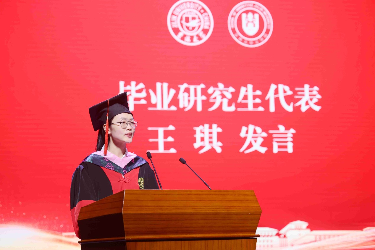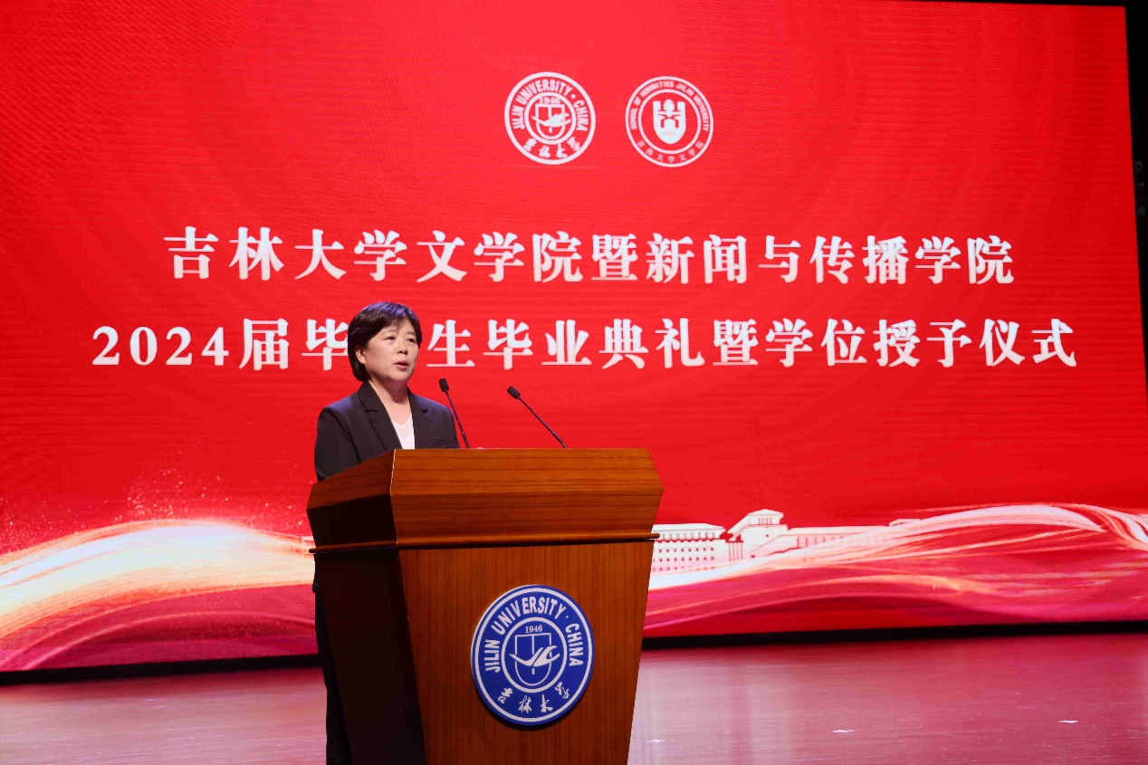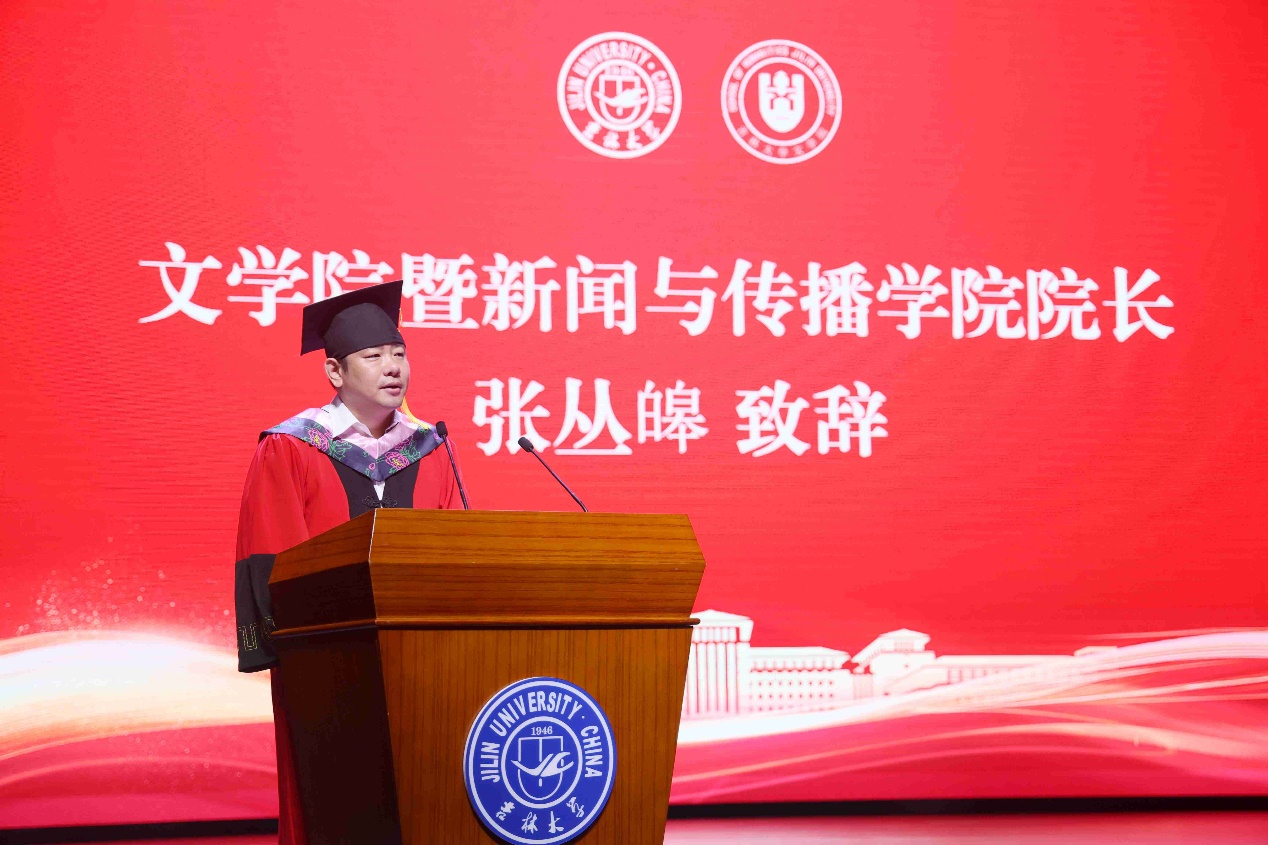 典礼上,本科毕业生代表、吉林大学2023年度十佳大学生、2020级新闻学专业张珺涵同学,毕业研究生代表、2021级中国现当代文学专业博士毕业生王琪同学分别发言,回顾了在学院多年来的求学生涯,表达了对母校、学院、老师、同窗、家人的感谢,坚定了未来秉持“求实创新,励志图强”校训的决心。