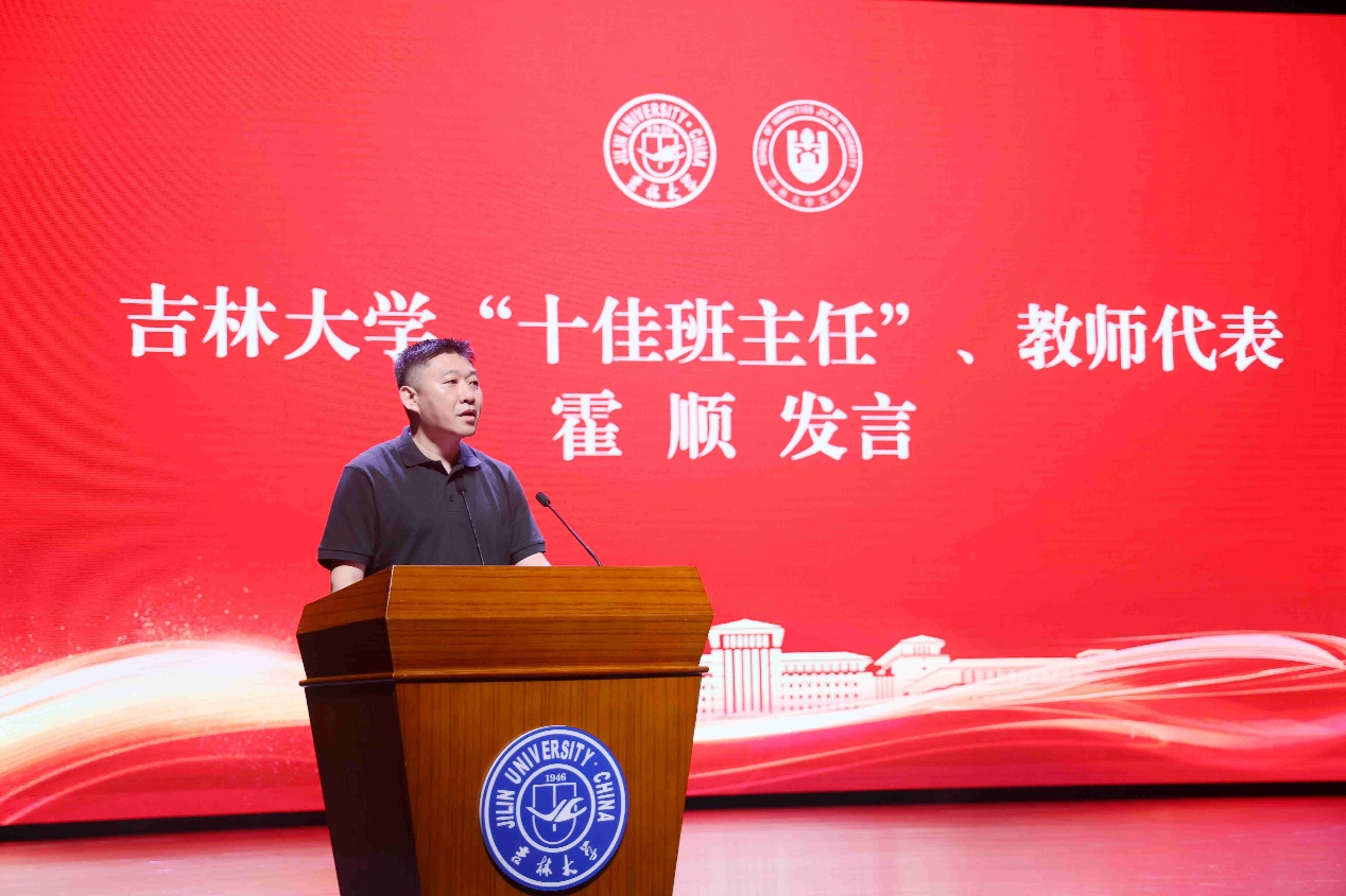 随后,吉林大学2020-2021学年十佳班主任、2020级本科生班主任代表霍顺老师发言。他说,2024届毕业生是“特殊时期”的亲历者、见证者,但困难只会使未来的脚步更加坚定。他鼓励所有毕业生要勇于改变,勇于面对现实;要脚踏实地,养成终身学习的习惯;要学会爱,懂得爱,保持独立的人格,把快乐带给全社会。