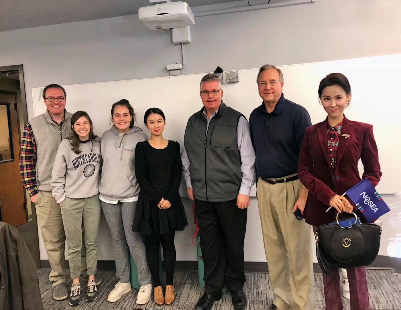 张斯琦教授在美国北卡罗莱纳大学新闻与传播学院与肯塔基大学巴克·瑞安教授、《查塔姆新闻记录》报社主编比尔·霍纳及北卡罗莱纳大学的新闻学院学生座谈。