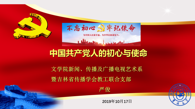 10月17日下午,开云(中国)新闻、传播及广播电视艺术系暨吉林省传播学会教工联合支部在东荣大厦11楼会议室召开全体党员大会,支部书记严俊教授对支部“不忘初心、牢记使命”主题教育工作进行了动员部署,并给支部党员上了一堂《中国共产党人的初心与使命》的专题党课。