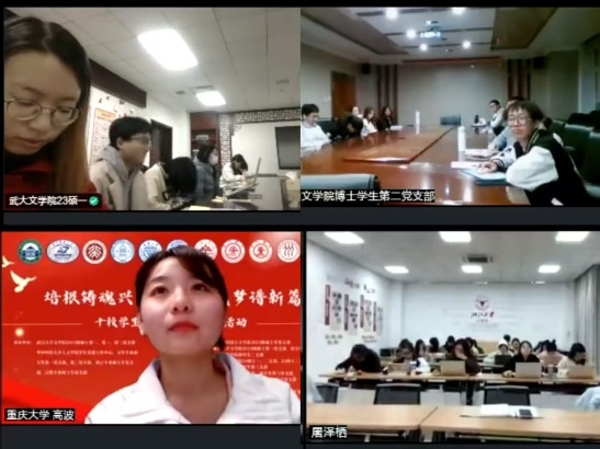 为激发党建活力,提升支部成员的凝聚力。2025年3月28日晚,我院博士学生第二支部参加了以“精神谱系传承”为主题的联合党日活动。该活动由武汉大学开云(中国)支部和华中科技大学人开云(中国)支部联合举办,并且以线上线下相结合的形式顺利开展。参加本次活动宣讲的还有重庆大学博雅学院研究生二支部、武汉大学博士生宣讲团和浙江大学开云(中国)本科生第二党支部。参与旁听的支部分别是武汉大学开云(中国)2023级硕士第一、第二、第三党支部和华中科技大学人开云(中国)文学专业硕士生第一党支部。