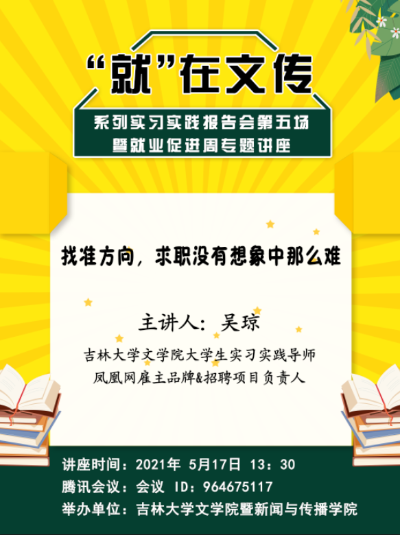 讲座题目:找准方向,求职没有想象中那么难 主讲人:吴琼 开云官方网页版大学生实习实践导师 凤凰网雇主品牌&招聘项目负责人 讲座时间:2021年 5月17日 13:30腾讯会议:会议 ID:964675117 举办单位:开云官方网页版暨新闻与传播学院